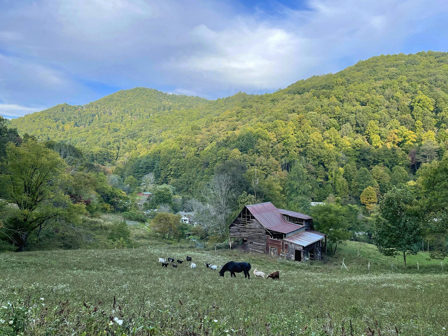 As I wind my way along back down the mountain towards the big Poplar I catch a glimpse of the field. It looks glorious now! Bathed in golden light, gleaming green against the sky's deep blue. I take a moment to honor the trees who used to stand here and were cut by our land ancestors. They no long stand tall but stretch out horizontally, laid with skill across each other to form the 120 year old barn that still shelters the animals from the elements.