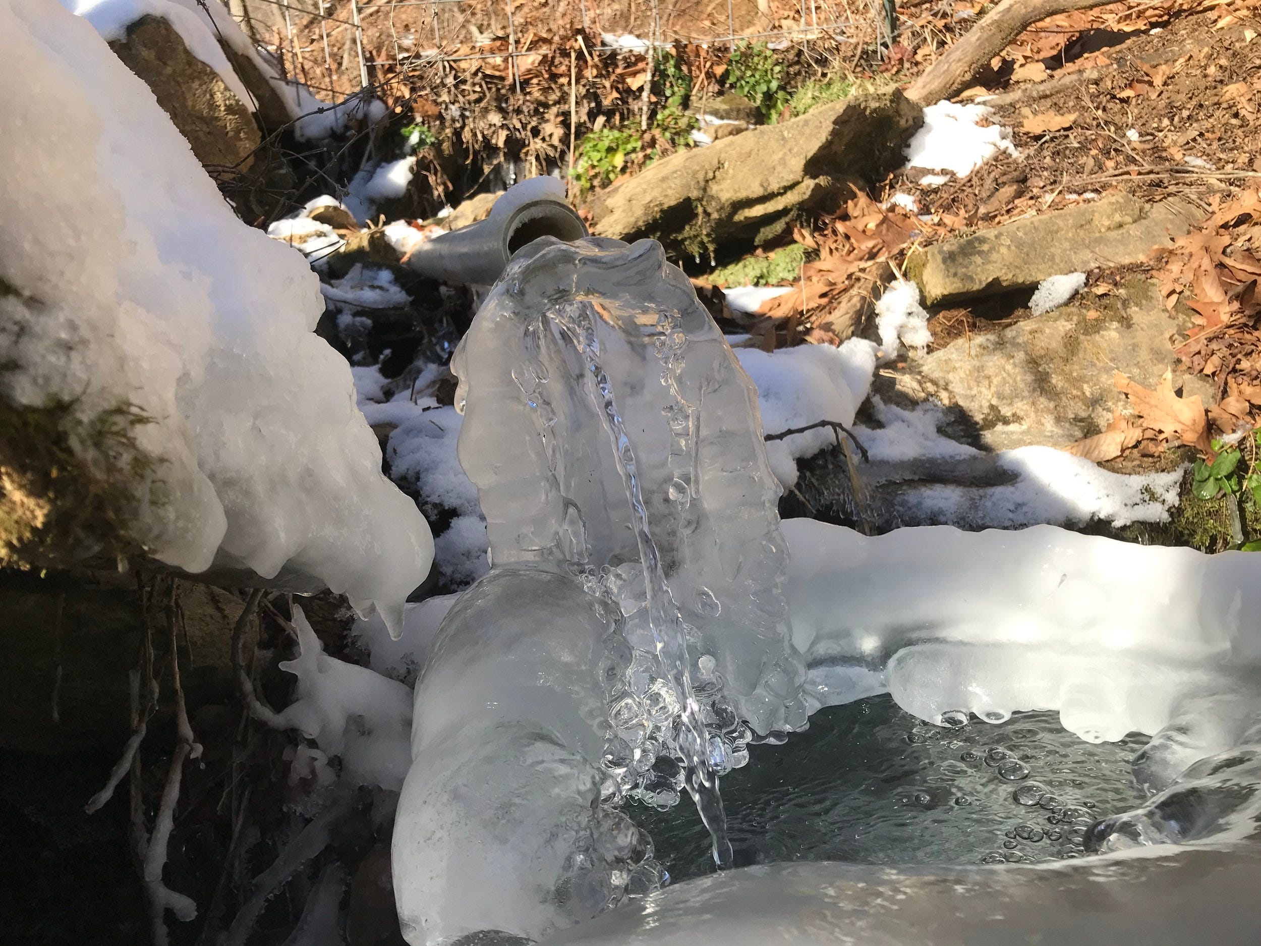The sheep's water bucket is a solid block of ice. I haul it over to the creek hoping the flow of water might thaw it out a little or at least give them a couple of inches to drink from. We have a pipe in the creek that channels water into a metal bucket making it easier for the horse to drink from the otherwise shallow creek. As I approach the pipe I see it has transformed over night. The water is still flowing through it into the bucket but it is now wearing a cloak of ice that extends around both sides of the pipe and down to the bucket. The ice continues half way around the rim of the bucket forming solid arms holding the pool of running water.